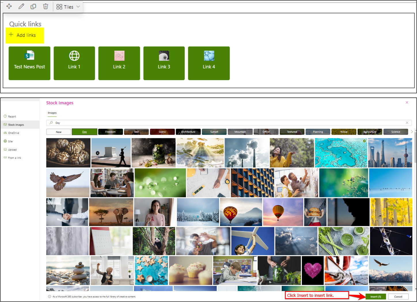 1. To add links to the quick link web part, click Add Links; default options will be displayed. Select from the relevant option and click on Insert.