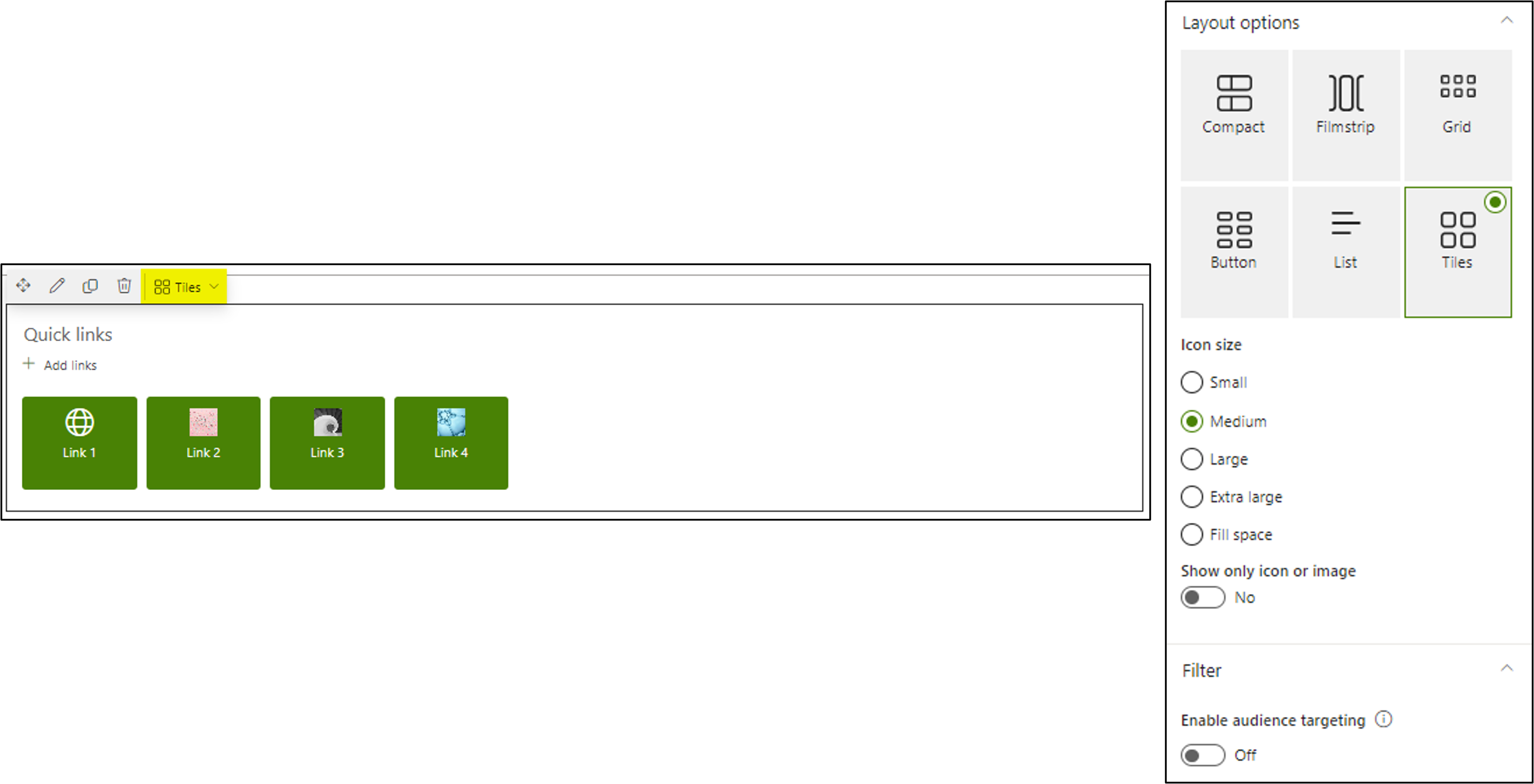 - Tiles: The Tiles layout in the Quick Links web part displays links as a set of customizable tiles. The editing option to change the size of the icon or show only the icon or image is available.