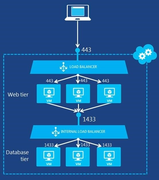 Now, this code base might need to communicate with the SQL database and it makes a request over port 1433 to internal load balancer which in turn routes the request to one of several virtual machines which are hosting the SQL Server.