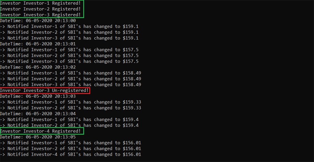 On the output screen, you can see the notification of stock exchange rates only for registered investors with SBI. Here Observers can be added and removed independently at run-time and make the system loosely coupled.