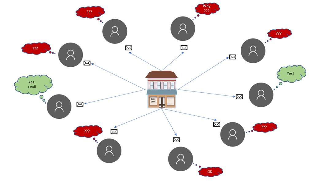 After a few weeks, he visits the nearest book store again and it seems new stock has still not arrived. The poor student keeps visiting the store and still can't find the novel. Now, the book storekeeper realizes that it's inconvenient for someone to keep visiting and leaving empty handed. So the bookstore upgrades the system to keep the data of each person who visits to store. When any new books arrives in stock, immediately message/email is sent to all users in the book store database.
