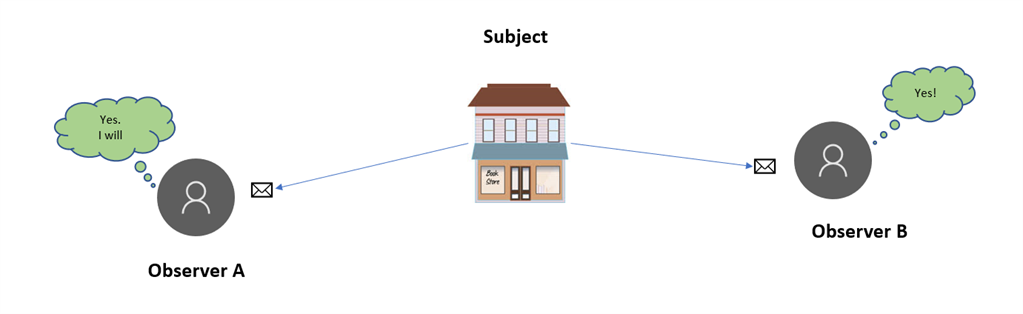 Let’s get a bit technical now to understand the terminology of the observer pattern. Here book store acts as a Subject, Users act as observers. Here subject maintains a list of its dependents, called observers, and notifies all registered observers automatically of any state changes.