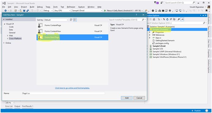 Go to Portable project -> Add new Item -> Cross – platform -> Forms XAML Page.