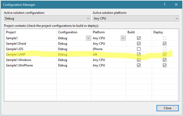Default UWP Programming is not selected in the Project build, we have to select the project (Build -> Configuration Manager), because UWP application must refer to the x86 architecture, not for any CPU option (check other projects, default it was selected as Any CPU option and iOS selected as iPhone or iPhone simulator)