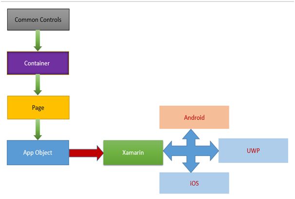 Page holds the container and it holds the collection of controls, Internal diagram for Xamarin Forms