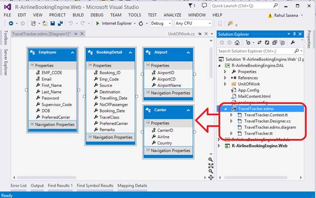 In R-AirlineBookingEngine.DAL project, I have added the Entity Framework with the name of TravelTrker.edmx.