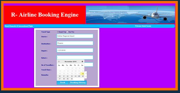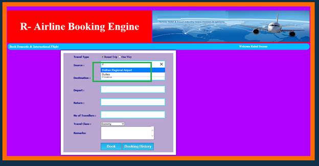 After making registration or login, you will be redirected to Booking airline page. Here, in source and destination, I am using auto suggestion feature.