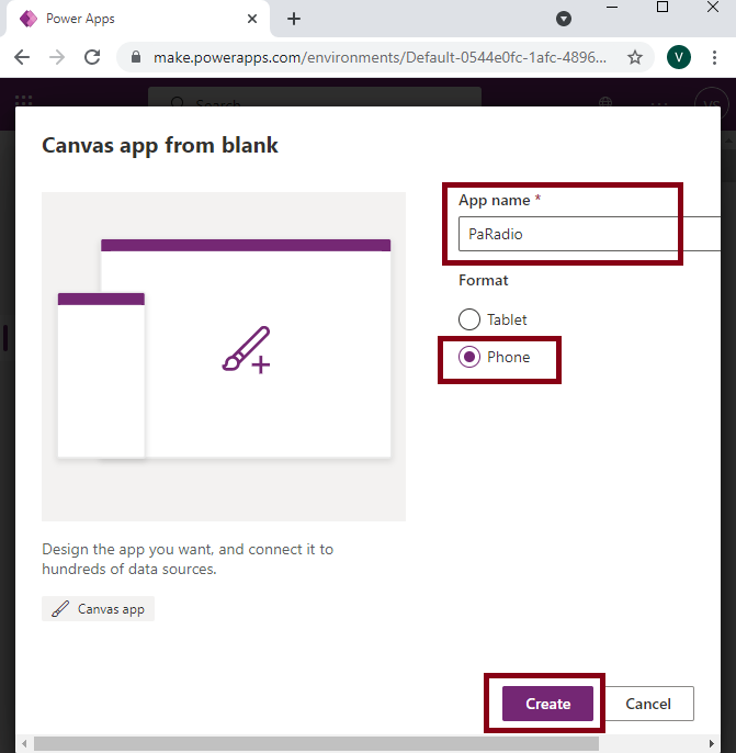 First, Click Create (+ ) and Select the Canvas app from blank.