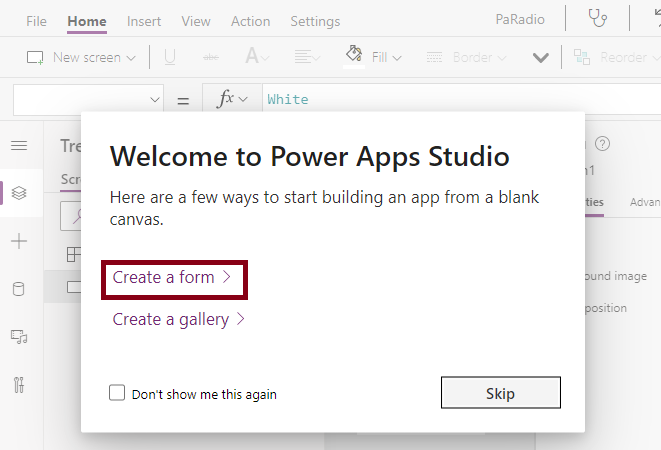 Now, In the Power Apps studio environment, Select the Create a form option,