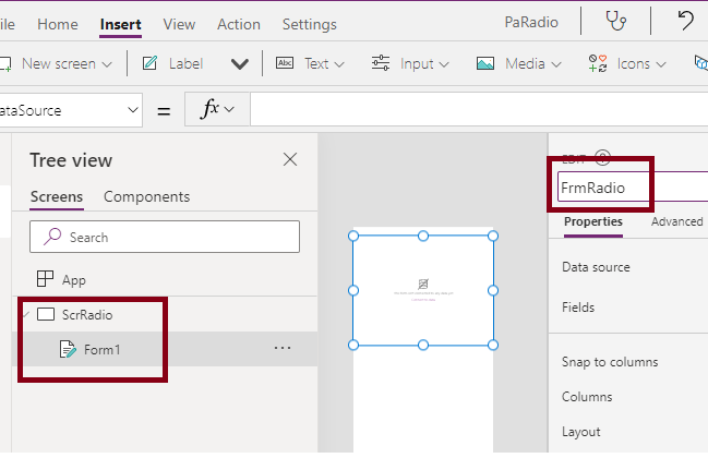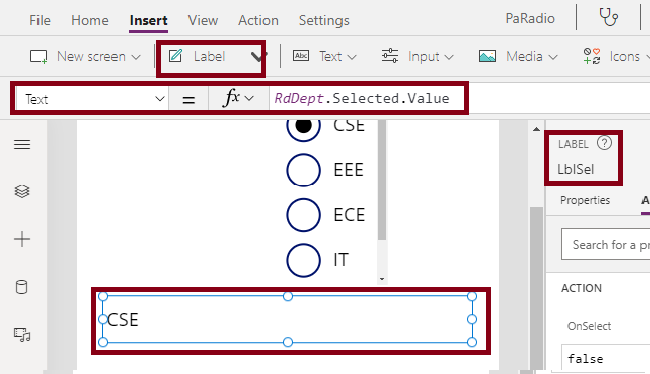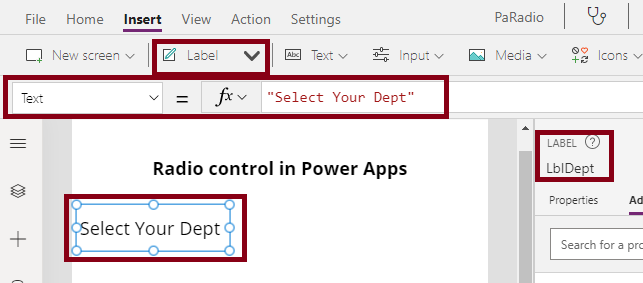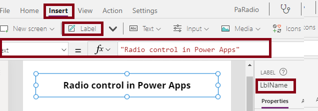 Insert the Label Control and set the Name property as LblName and Text Property as Radio Control in Power Apps.