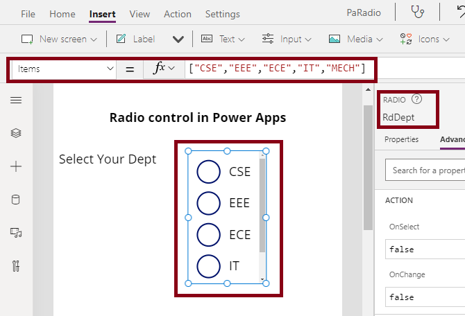 Insert the Radio Control and set the Name property as RdDept and Set the Items Property as ["CSE","EEE","ECE","IT","MECH"] for dept items,