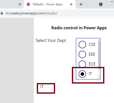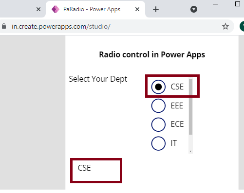 Now we can see the preview of your App in Power Apps Studio, and the output of the PARadio is,