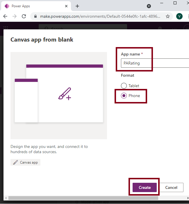 Next, give the App name as PARatingand Format as Phone, and then click Create.