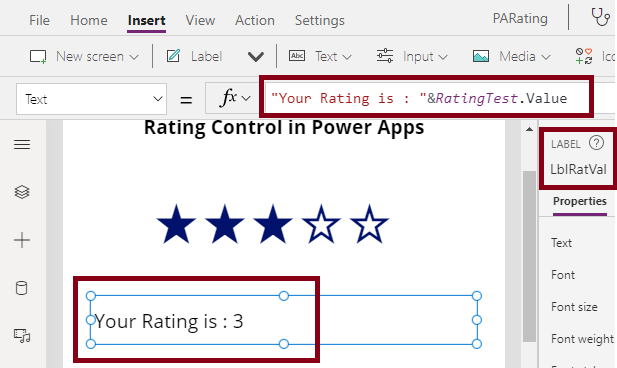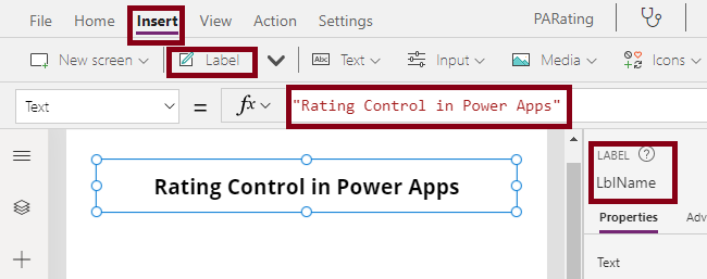 Insert the Label Control and set the Name property as LblName and Text Property as Rating Control in Power Apps.