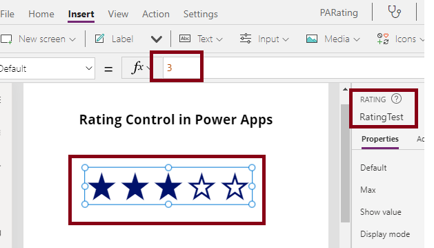 Insert the Rating Control and set the Name property as RatingTest and set the Default value is 3,