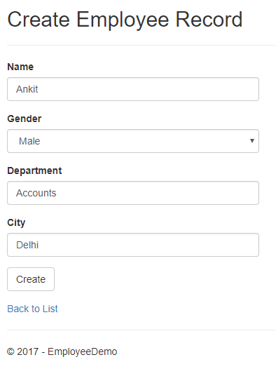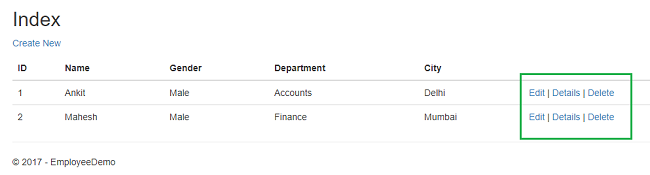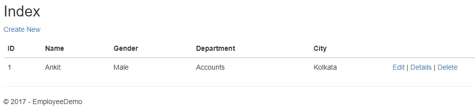 After inserting the data in all the fields, click on "Create" button. The new employee record will be created and you will be redirected to the EmployeeIndex page, having records of all the employees. Here, we can also see action methods Edit, Details and Delete.