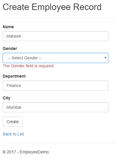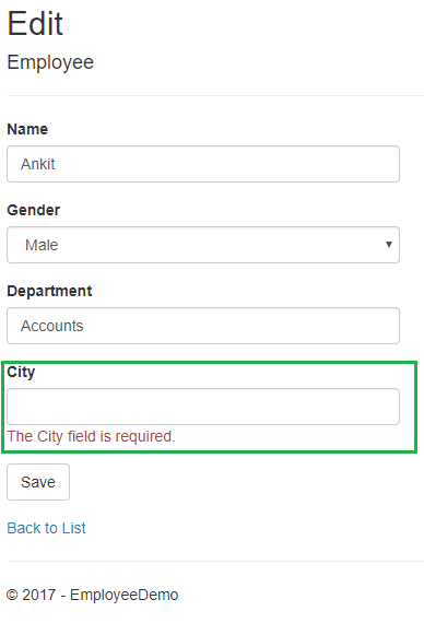 If we miss any fields while editing employee records, then the Edit page will also throw required field validation error message.
