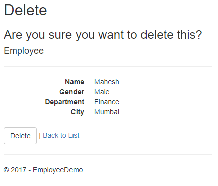 Click on "Back to List" to go back to the EmployeeIndex page. Now, we will perform Delete operation on an employee named Mahesh. Click on Delete action link which will open DeleteEmployee page asking for a confirmation to delete.