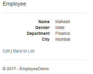 If you want to see the details of any Employee, then click on Details action link, which will open the EmployeeDetails page as shown in the image below.