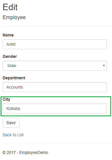 If we want to edit an existing employee record, then click on Edit action link. It will open EditEmployee page as below where we can change the employee data.