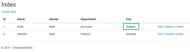 Here, we have changed the city of an employee named Ankit from Delhi to Kolkata. Click on "Save" to return to the EmployeeIndex page to see the updated changes as highlighted in the image below.