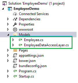 Add one more class file to Models folder. Name it as EmployeeDataAccessLayer.cs . This class will contain our Database related operations.