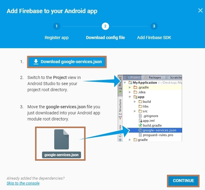 You need to download a google-services.json file and just move the downloaded google-services file into the Android app.