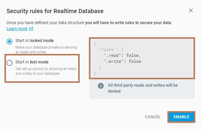 Security Rules for real-time database Select strat in test mode
