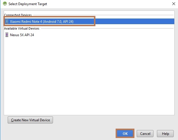 Next, go to Android Studio and deploy the application. Select Emulator or your Android Device with USB debugging enabled. Give it a few seconds to make installations and set permissions.