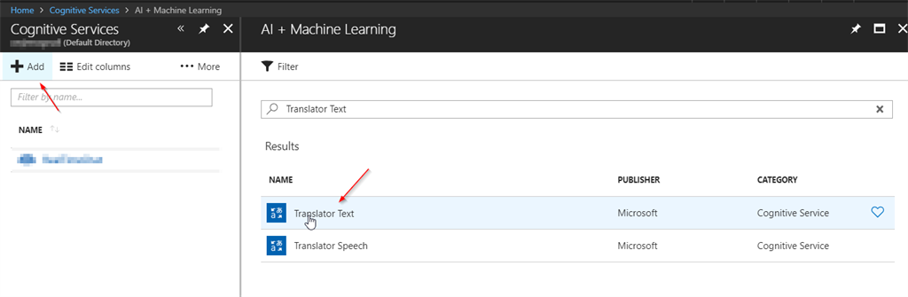 - Click Add Button and Search for Translator Text and Select it and click the Create Button.