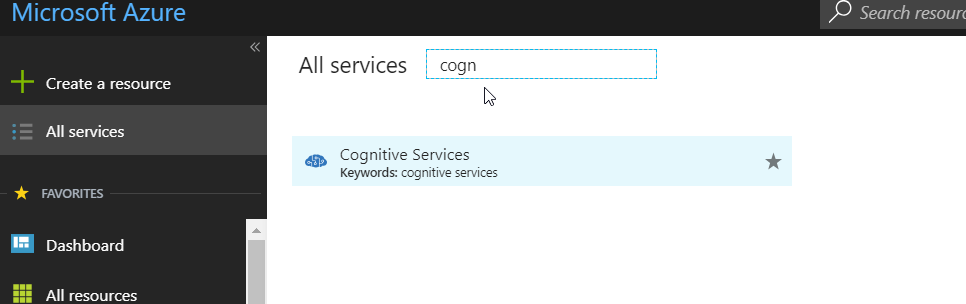 - Login to Azure Portal and Search for cognitive service and select Cognitive Services.