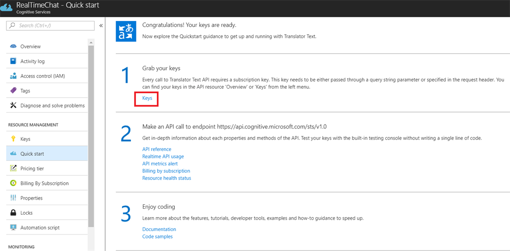 - After the Cognitive Service is created, you can obtain the Subscription Keys from the Quick Start Menu.