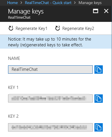 - By default, two keys will be provided. You can copy the key1 value and put it in usersecrets.json for the application to access it.
