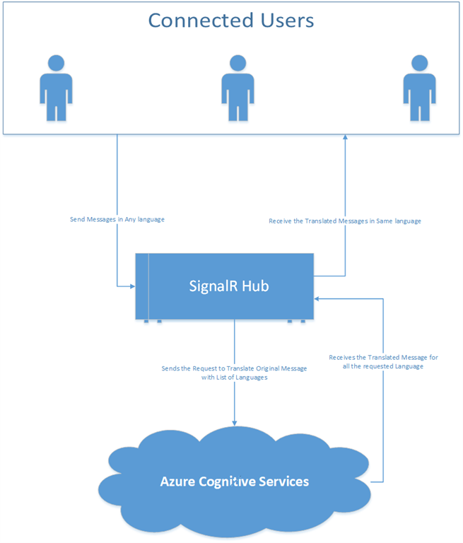 In this article, I will discuss how to do real-time translation chat using the language of your choice in two-way communication (sending and receiving) using SignalR and Cognitive Services Translate API in .NET Core 2.1. I have also used one of the new features of.Net Core 2.1 HttpClientFactory – TypedHttpClient to make API calls. This is a simple chat application where the user can login with their name and choice of language that they want to use to send and receive the message. When the user sends a message, it translates the text in real time and sends it to other users with the choice of their selected languages and vice versa.