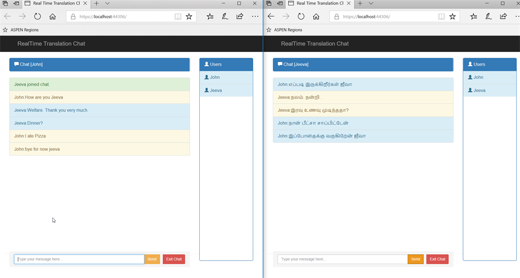 Finally, when we run the application in multiple windows, you can do the realtime translation chat in the selected languages. I have also verified the application by hosting in Azure with the Free Application Plan Tier. In the future, it will be possible to bring this kind of feature to popular messaging apps like whatsapp when the group chat is having people who speak different regional languages and enabling automatic translation settings would help a lot. I have posted the entire source code in my