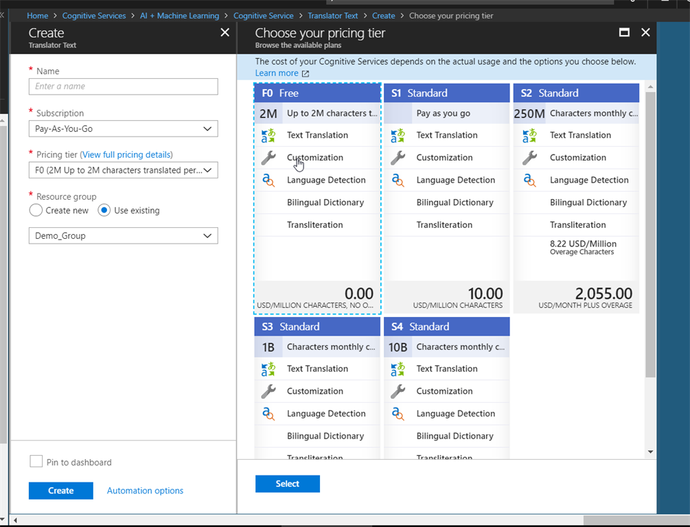 - You can select the Free Tier for Development purpose. It allows upto two million characters to translate per month in the Free Tier.