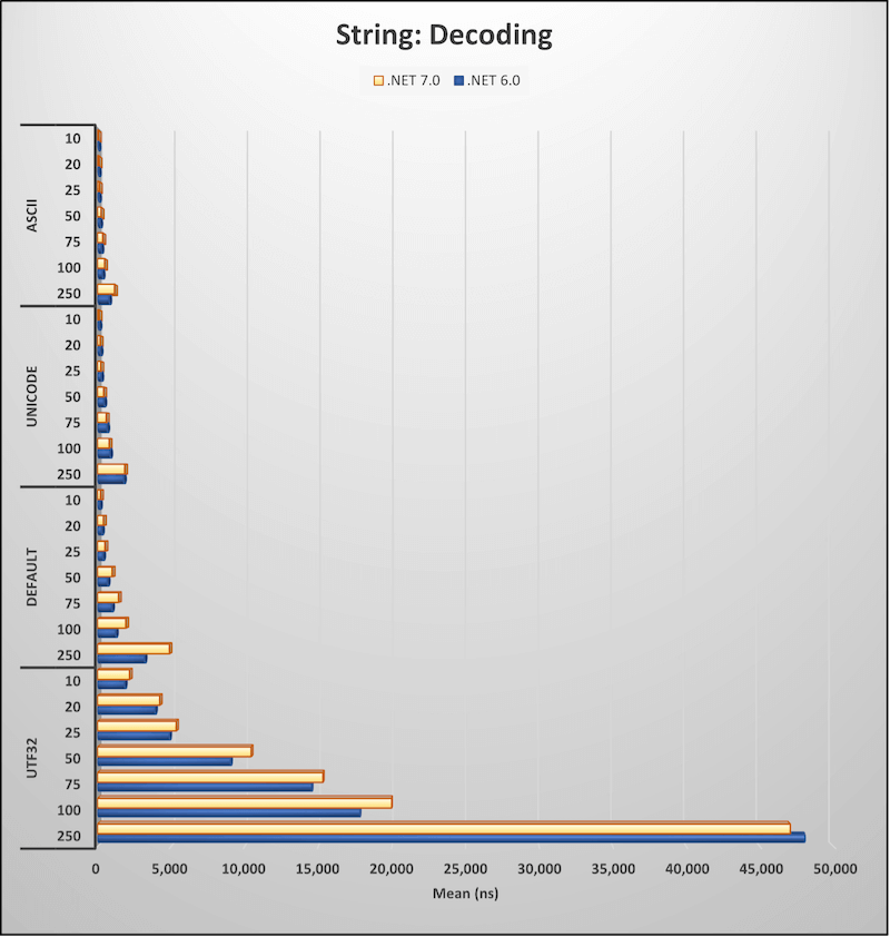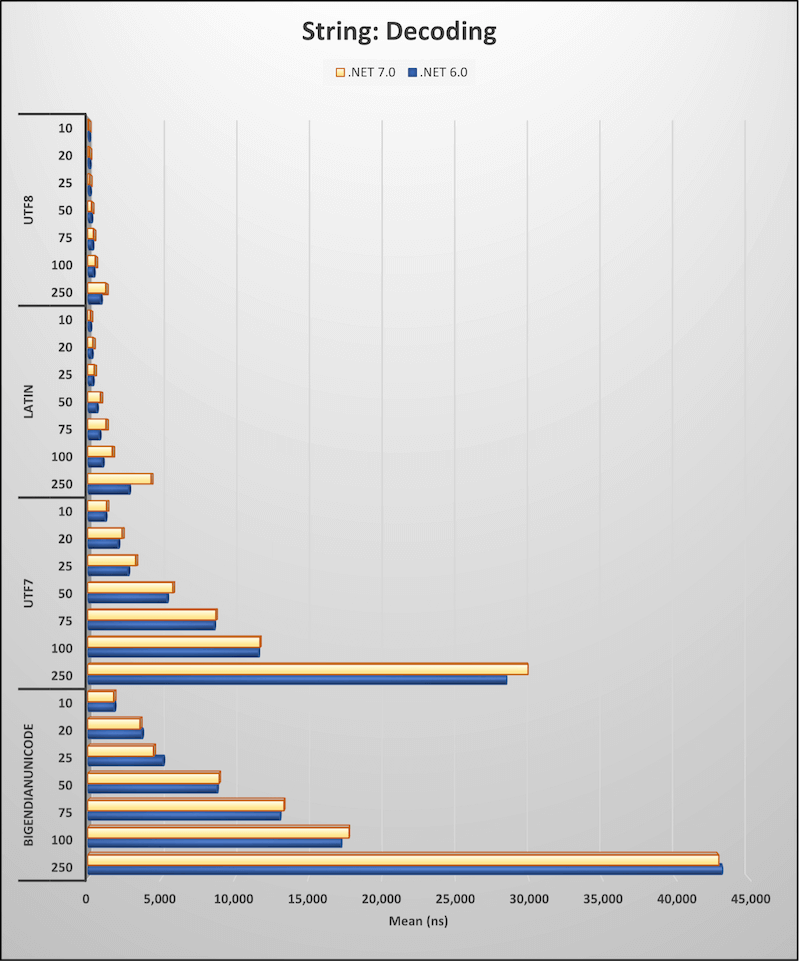 As you can see in these charts, using UTF7 is the slowest for encoding and for decoding it’s not the slowest but close.