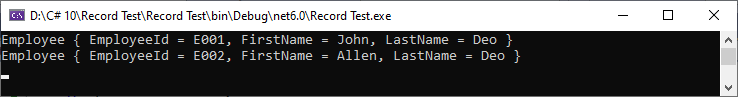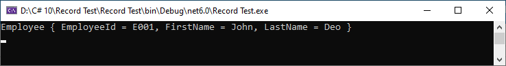 // output: Employee { EmployeeId = E001, FirstName = John, LastName = Deo }