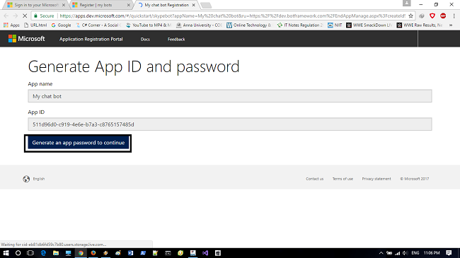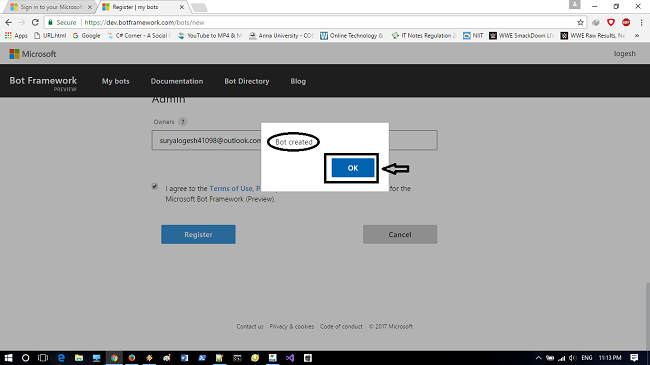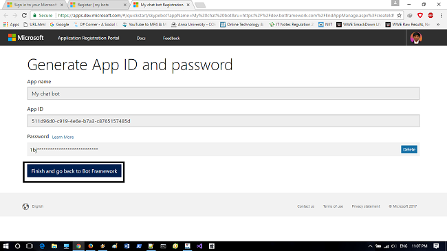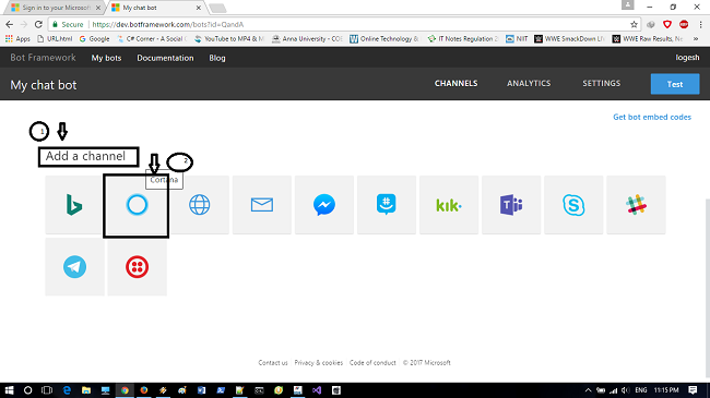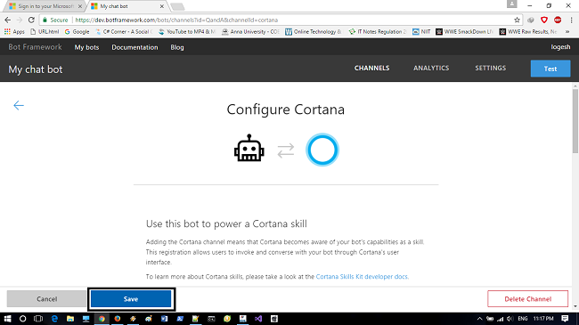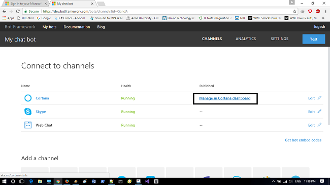 The bot has been successfully created with the registration process. Now, let's configure the bot for running one more extra channel. My selection is Cortana but you can select any type of channel you want for service.