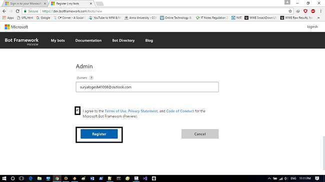 The administrator email id will be specified. Select the checkbox for accepting the terms of use, privacy of statement, and code of conduct.