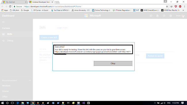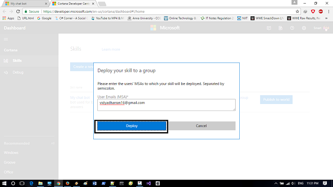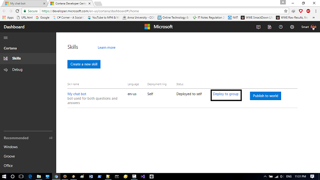 The bots that are being published to Cortana are done from the dashboard. It can be deployed for our own use or we can deploy to a user’s group or to the world. (I have deployed the bot to the users group, you can deploy it group or publish to world).