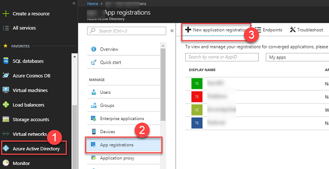 - From the left side, select Azure Active Directory, go to App registration, and click on "New application registration".
