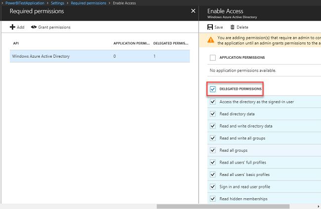 - For Windows Azure Active Directory, assign all delegate permissions.