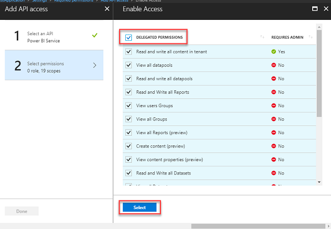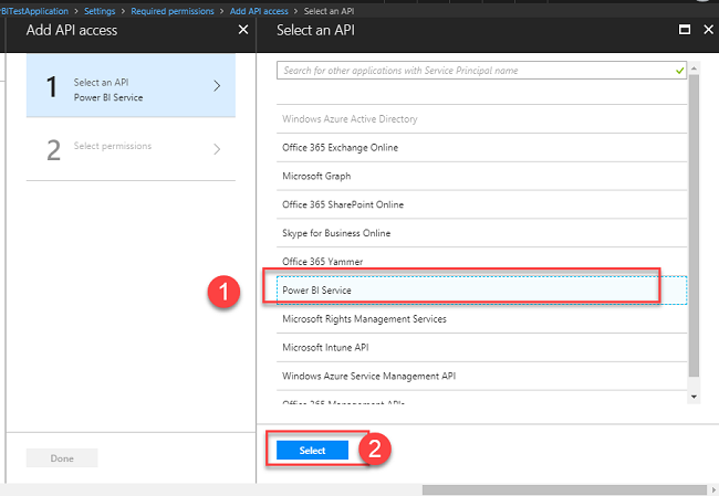 - Now, it’s time to grant and assign the permission to already created Power BI application.