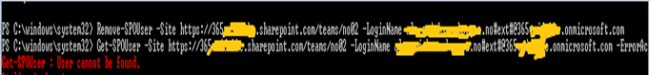 - You can verify whether the user has been removed successfully by running the “Get-SPOUser”, which we ran in the previous step and it should return an error, thereby stating that the user cannot be found. This confirms that the user has been removed successfully.
