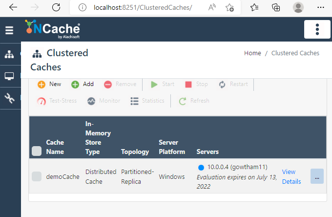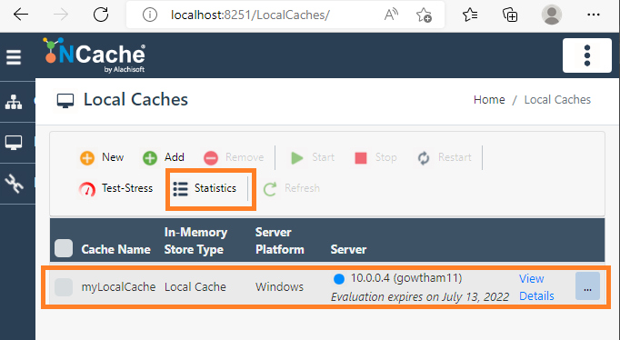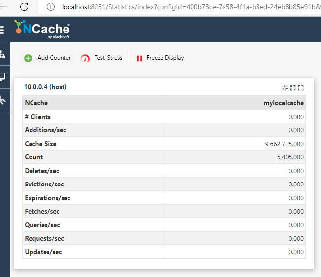 Now the stress test has been completed, check the count from cache statistics. You can go to Cache statistics by selecting our cache from NCache Web Manager and clicking on the statistics icon.