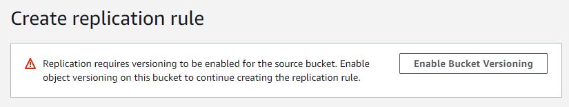 Before configuring the replication rule, if Bucket Versioning is not enabled then you need to enable Bucket Versioning on source and target bucket else you will receive error message like this on replication configuration page,