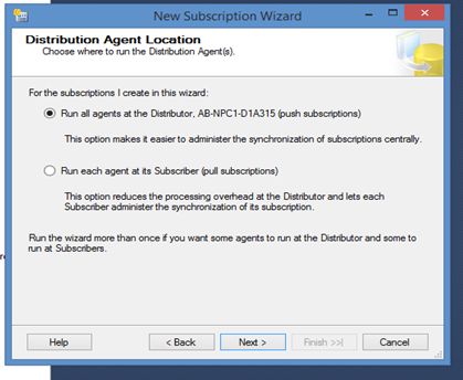 Now, it’s asking agent to run continuously, run on demand or schedule it. This depends on your business requirements how you want your data. Here I am continuing with default selection run continuously. ->click Next ->Run immediately ->Create the subscription -> Finish.