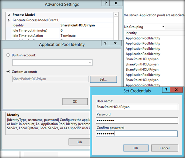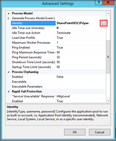 The identity under which they were running definitely had a password expiry/reset. Let’s go to the advanced settings option where we can update the password for the user.
