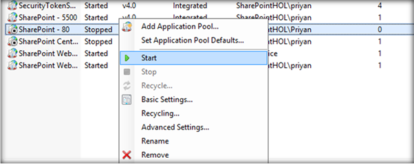 This time, the application pool for the web application has started. Now, do the same for the Central Administration Web application pool, as well.